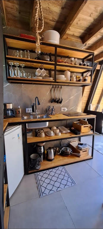 No espaço contamos com um encantador chalé no estilo A-frame com 2 andares,dispostos em 20 m²,contando com uma cama quenn size,cozinha completa, lareira,sofá cama,banheiro,TV 32 polegadas com netflix,frigobar, air fryer, panela elétrica para fondue,cook top por indução e todos utensílios para tornar sua estadia confortável.